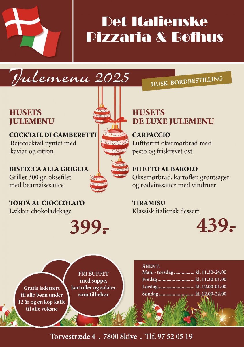 I vores hyggelige restaurant kan man i skønne omgivelser nyde en dejlig aften med ægte italiensk stemning, lækre italienske retter og gode vine.